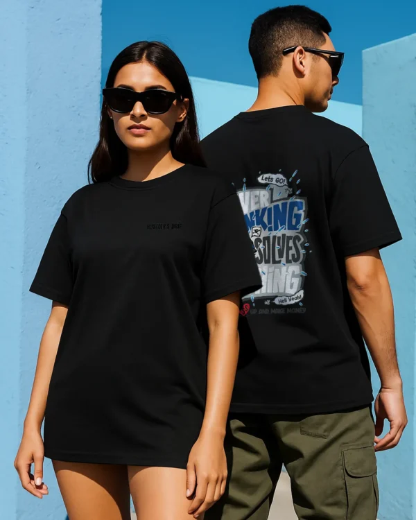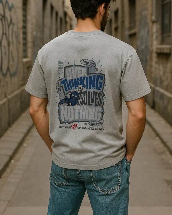 Break the cycle of overthinking with this energetic graphic t-shirt. The back features the bold message “OVER / THINKING / SOLVES / NOTHING” surrounded by fun cartoon elements and motivational phrases. A perfect tee to inspire action and productivity.