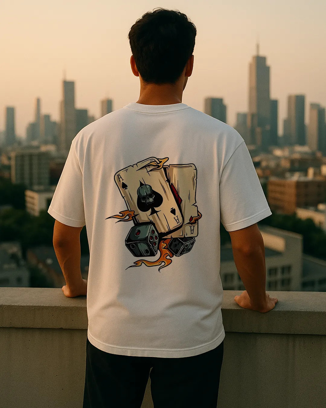 The Ace of Spades, often associated with power and sometimes mortality, takes on a unique twist with the incorporated skull. Paired with the dice, symbols of chance, and the hint of the Ace of Hearts, representing luck and love, this graphic invites interpretation and adds depth to your style. Wear it as a personal statement or for those who appreciate designs with layered meaning.