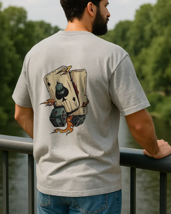 Made from a comfortable fabric (assuming 100% cotton or a similar blend for a soft feel), this standard fit t-shirt is perfect for everyday wear. The detailed and symbolic graphic on the back makes a strong visual statement, while the blank front keeps the focus entirely on the eye-catching design. Whether you’re a fan of card games, dice, or simply appreciate distinctive artwork, this tee offers a blend of style and intrigue.